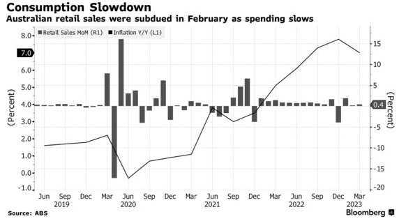 澳大利亚3月份零售额连续第三个月增长,主要受食品价格上涨的推动。在澳大利亚央行大举加息的重压下,家庭支出开始降温。