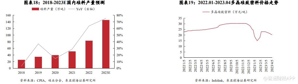 2022年,我国硅料产量达到82.7万吨,同比增长63.4%,根据硅业分会预测,随着各大硅料龙头厂商和众多新玩家的产能将于2023年迎来陆续释放,2023年硅料总产量有望达到145万吨,同比增长75.3%,对应将满足550GW以上的组件供给,较2023年350GW的装机预期出现明显过剩。