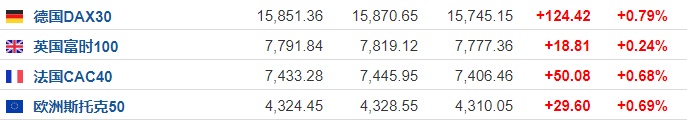 2.截至发稿,德国DAX指数涨0.79%,英国富时100指数涨0.24%,法国CAC40指数涨0.68%,欧洲斯托克50指数涨0.69%。