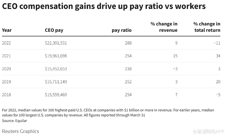这项研究由Equilar公司发布,审查了收入在10亿美元以上的美国上市公司中薪酬最高的100位CEO,截至3月31日。去年的一项类似审查显示,2021年CEO的薪酬增长了31%。