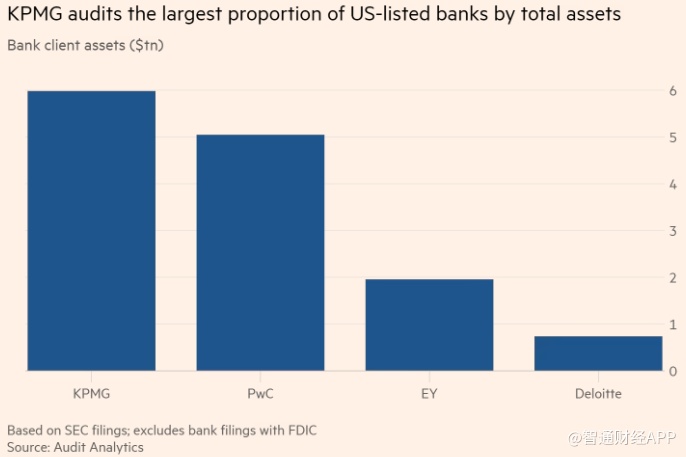 毕马威在金融服务行业长期以来拥有大量的审计业务,其中包括美联储和超过30家上市银行。2021年,公开上市的银行向毕马威支付了超过3.25亿美元的费用,占毕马威公共客户费用的14%左右。相比之下,普华永道占8%,安永占3%,德勤占2%。