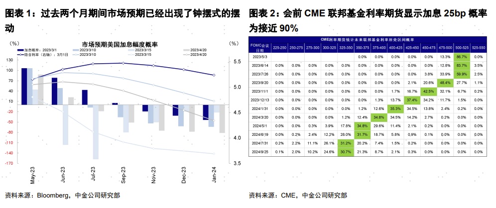 往前看,我们认为5月大概率可能是最后一次加息,除非发生意外供给冲击导致通胀风险激增。一方面,五一期间继续发酵的银行风险表明紧货币对金融体系的压力越发明显,另一方面因此可能导致的紧信用效果也将逐步显现,进而起到抑制增长和通胀的效果。对于市场更为期待的降息,我们认为仍有变数,如果当前的金融风险暂时平息下来,给定通胀接下来回落的路径,过快的降息预期可能并不现实。短期银行风险的再度暴露和债务上限风险临近会从避险角度“倒逼”宽松预期,但我们认为只要不发生系统性风险,这样一个“透支”的预期(当前市场预期9月降息,过去一度预期6月)在情况稳定后也会面临再度回吐的风险。从这个意义上看,当前CME利率期货预期和主要资产计入的9月之后连续降息的预期可能依然偏多。