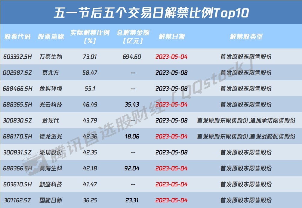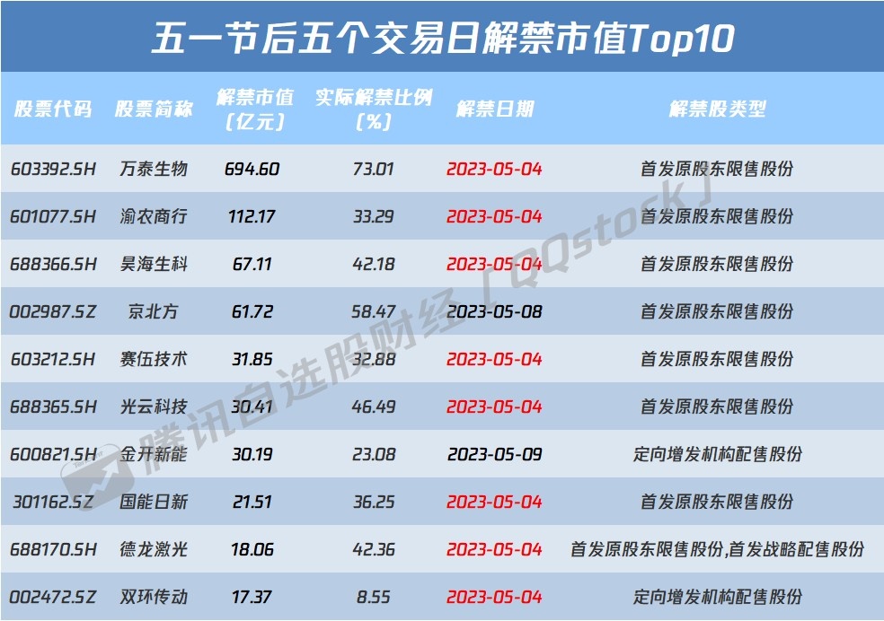从解禁比例来看,五一节后五个交易日万泰生物解禁比例达73.01%,其次解禁比例居前的分别为京北方和金科环境;从解禁市值来看万泰生物、渝农商行、昊海生科等股解禁市值居前。