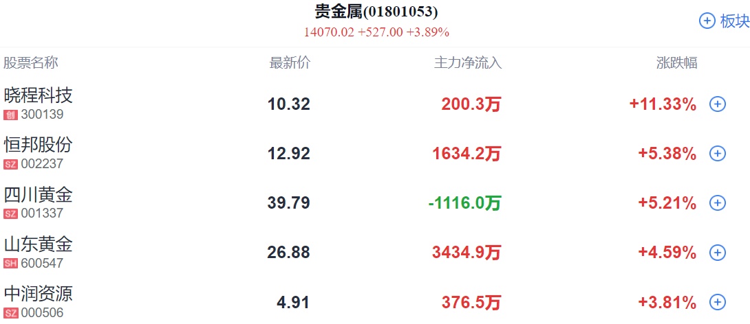 贵金属板块冲高,四川黄金涨超8%,中金黄金、山东黄金、银泰黄金、晓程科技等纷纷冲高。