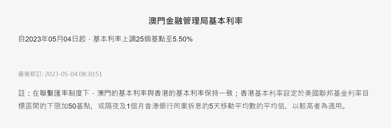 智通财经APP获悉,5月4日,澳门金融管理局宣布,即日起,基本利率上调25个基点至5.50%。
