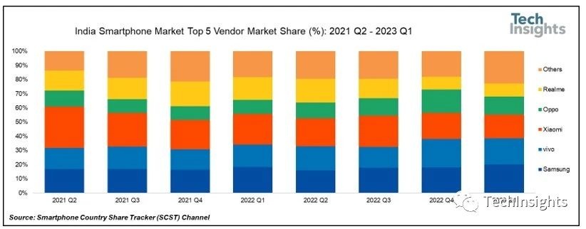 考虑到今年第一季度的缓慢开局,TechInsights预计印度智能手机市场在2023年将略有增长。
