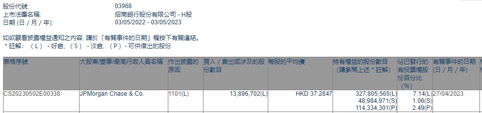 智通财经APP获悉,联交所最新资料显示,4月27日,小摩增持招商银行(03968)1389.6702万股,每股作价37.2847港元,总金额约为5.18亿港元。增持后最新持股数目约为3.28亿股,最新持股比例为7.14%。