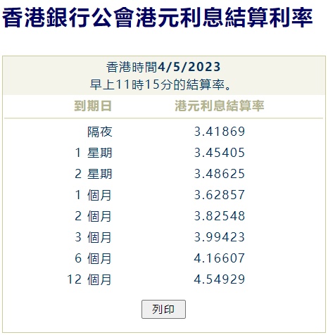 智通财经APP获悉,5月4日,港元拆息继续全线上升,香港银行公会数据显示,与楼按相关的1个月拆息连升11日,最新升至3.62857厘,创4个月高,较上日升0.07524厘。隔夜拆息升至3.41869厘;1星期拆息升至3.45405厘;2星期拆息升至3.48625厘;反映银行资金成本的3个月拆息升至3.99423厘。长息方面,6个月拆息升至4.16607厘;1年期拆息升至4.54929厘。此外,于同日,香港金管局将基准利率上调25个基点至5.50%。隔夜,美联储加息25个基点,并释放了这可能是本轮最后一次加息的信号。