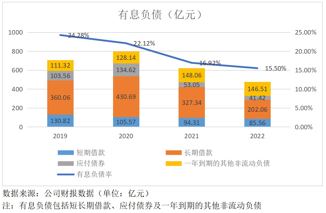 在行业下行回款受阻,及融资不畅的情况下,拥有健康的财务就显得格外重要,活下去才能谈发展。2020-2022年,中南建设资产规模减少了546亿元,负债规模减少了374.65亿元,其中有息债减少323.47亿元,占比高达86.34%,在指标上,扣除合约负债及相关非实际负债后,资产负债率下降5.12个百分点至47.93%。此外,有息负债包括短期借款、长期借款、应付债券以及一年内到期的其他非流动负债均呈现下降趋势,有息负债率下降6.62个百分点至15..5%,均优于行业水平。