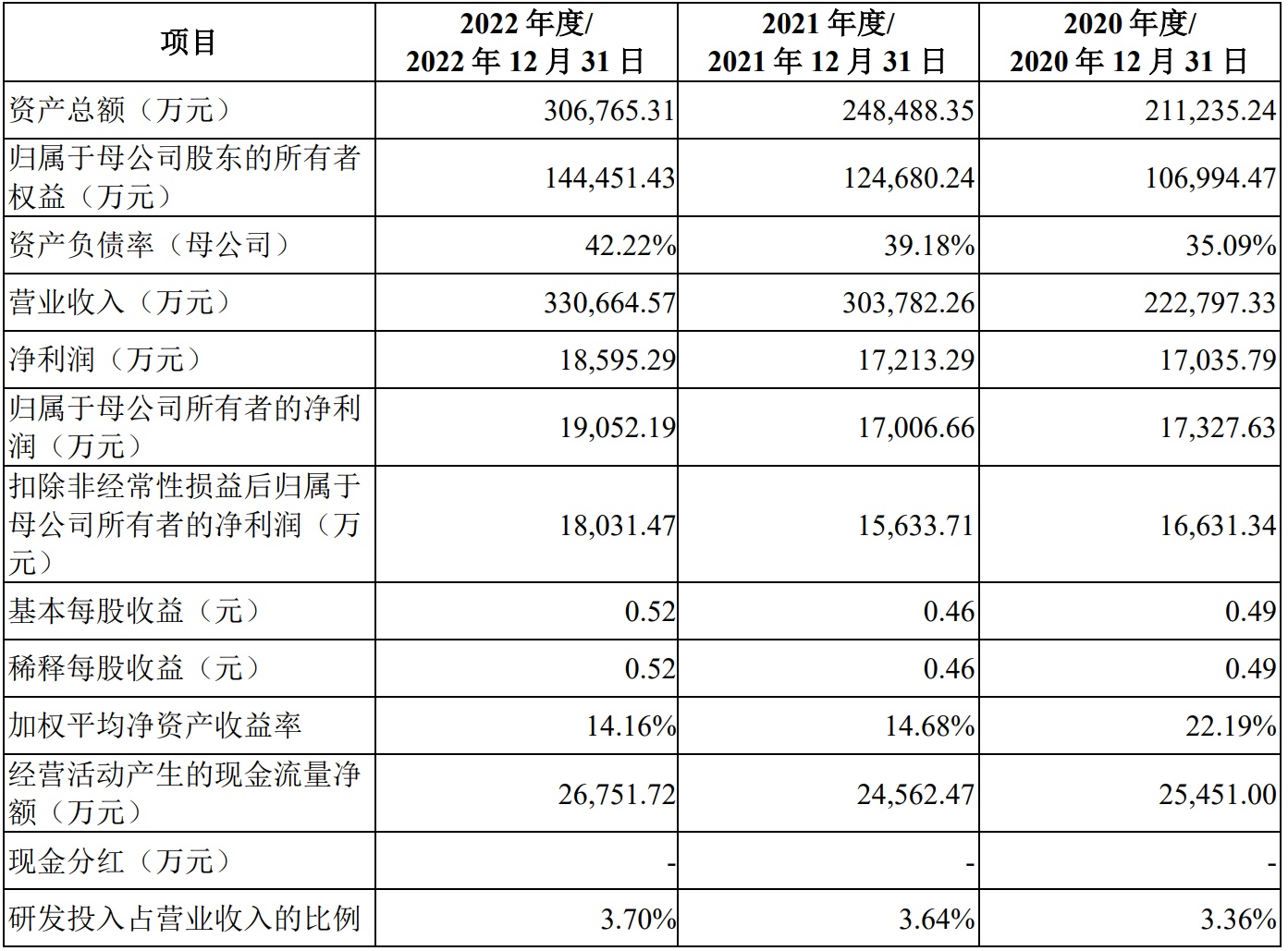 财务方面,于2020年度、2021年度及2022年度,公司实现营业收入分别约为22.28亿元、30.38亿元、33.07亿元。公司净利润分别约为1.7亿元、1.72亿元、1.86亿元人民币。