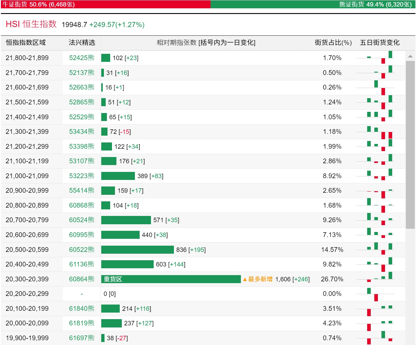 法兴恒指牛熊证街货分布图中的数据显示,熊证街货重货区和最多新增都在20300-20399区间,该区间最新熊证数量为1606张,较上一交易日增加246张。