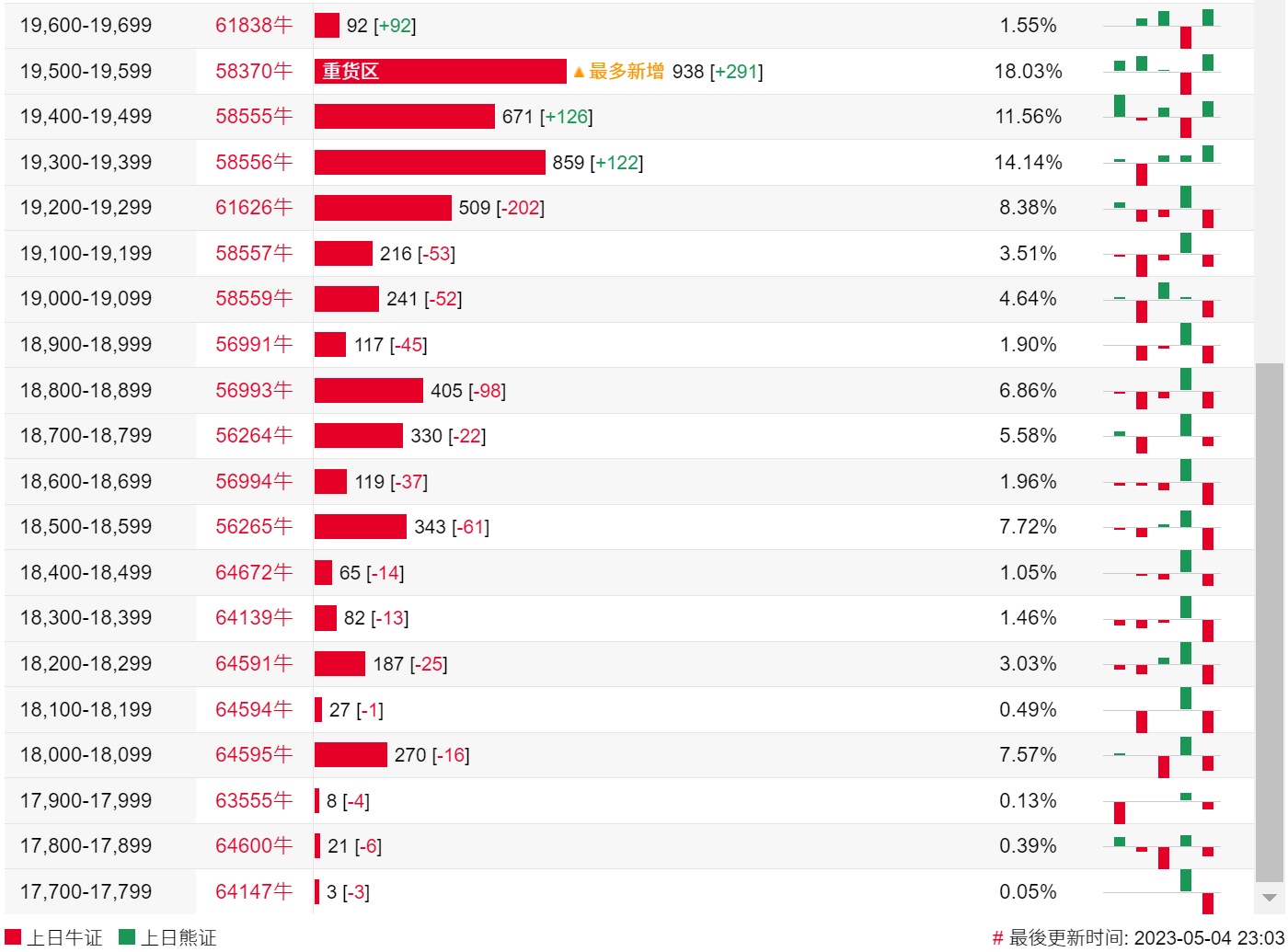 牛证街货重货区和最多新增都在19500-19599区间,该区间最新牛证数量为938张,较上一交易日增加291张。