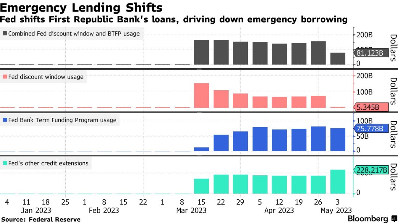 智通财经APP获悉,上周,金融机构从美联储获得的紧急贷款大幅下滑,部分原因是第一共和银行(FRCB.US)被接管,而该行占到未偿还贷款的很大一部分。根据周四公布的数据显示,在截至5月3日的当周内,美联储通过两个后备贷款工具向金融机构发放的贷款余额为811亿美元,前一周为1,552亿美元。最新数字是3月份银行业动荡开始以来的最低水平。