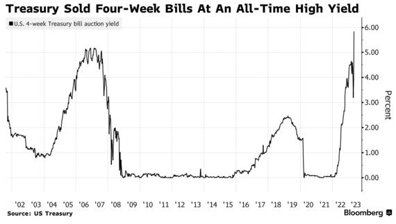 美国财政部以有史以来最高的收益率出售了一个月期美债,突显出在美国财长耶伦宣布美国政府最早可能在6月初触及上限之后,债务上限格局发生了多么迅速的变化。