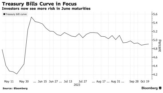 就在上周,财政部以3.83%的价格出售了期限为5月30日的一个月期美债,投资者纷纷抢购被认为受美国潜在违约影响较小的债券。当时,更广泛的市场定价表明,拖欠债务的风险在夏季晚得多。