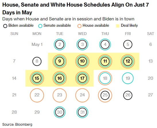 实现某种政治解决方案(即使只是短期的)的窗口正在缩小,这加剧了紧迫性。从现在到6月1日,也就是财政部发出警告的日期,美国总统拜登和参众两院议员将同时在纽约停留七天。