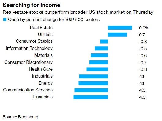 在标普500指数的11个主要行业板块中,只有两个板块实现收涨。周四,房地产板块跑赢大盘,收涨0.9%,公用事业板块紧随其后,收涨0.7%。周四,标普500指数收跌0.72%。