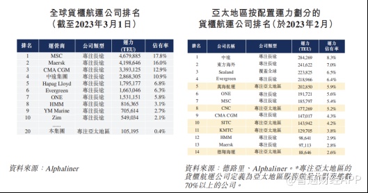 德翔海运招股书显示,公司是一家专注于亚太地区且发展迅速并最具盈利能力的货柜航运公司之一。公司主要在亚太地区经营业务,根据德路里报告,按航运量计,亚太地区是最大且增长最快的地区之一。按船队规模计,公司截至2023年3月1日在全球货柜航运公司中排名第20。