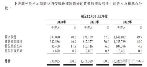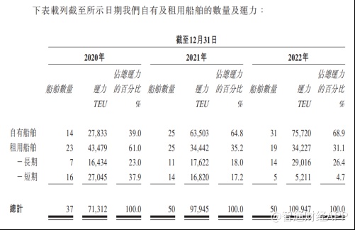 截至 2020年、2021年及2022年12月31日止年度,公司的平均运费为每TEU 485美元、每 TEU 1084美元及每TEU 1476美元,2020年至2022年的复合年增长率为74.5%。公司船舶数量由2020年的37艘增长至2022年的50艘,同期运力由7.13万TEU增长至11万TEU。