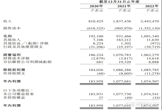 财务方面,于往绩记录期间,公司的业绩快速增长。截至2020年、2021年及2022年12 月31日止年度,公司产生的收入分别约为8.10亿美元、18.37亿美元及24.44亿美元;同期净利润分别约为1.84亿美元、10.78亿美元及10.75亿美元。