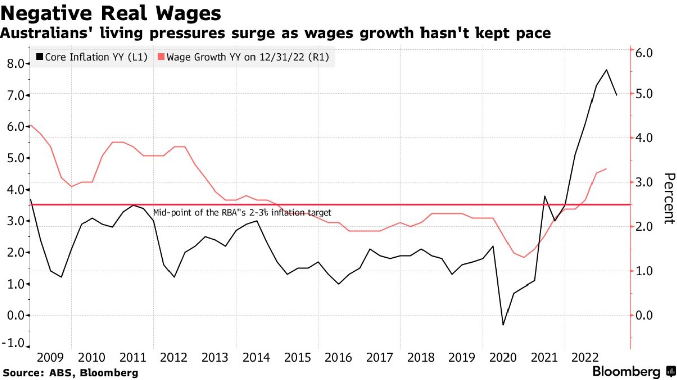 澳洲联储预测,澳大利亚今年GDP将增长1.25%,低于2022年的2.7%。此外,该行预计到2025年中期,这一比例将上升至2%。今年晚些时候,失业率预计将从目前的3.5%升至4%,到2024年底将达到4.5%。