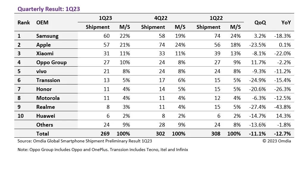 智通财经APP获悉,5月5日,根据Omdia最新智能手机出货报告显示,2023年第一季度的出货量总计为2.69亿台,同比下降了12.7%,环比下降了11.1%,其中,三星品牌跌幅较大,同比下降18.3%,苹果的出货量与2022年第一季度持平。