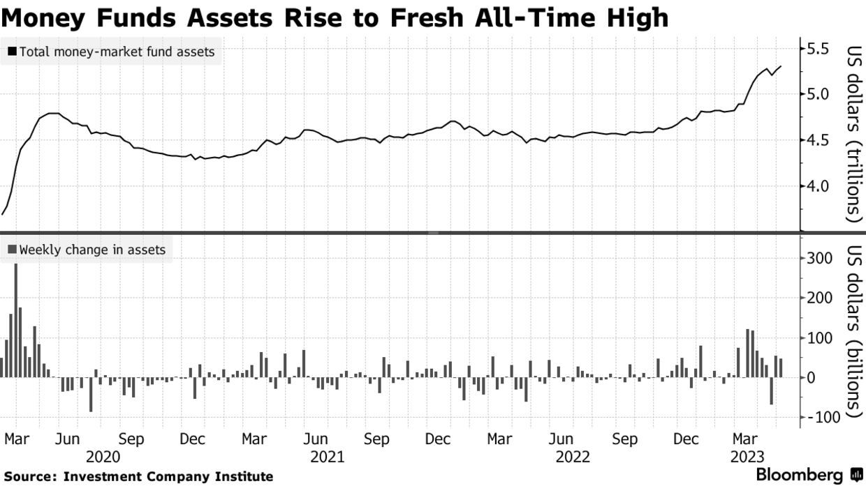 智通财经APP获悉,过去一周,由于银行业危机“死灰复燃”加剧市场担忧、以及美联储加息之下利率提高,货币市场基金资金规模攀升至创纪录高位。美国投资公司协会的数据显示,在截至5月3日的一周内,约有472亿美元流入美国货币市场基金,总资产规模达到创纪录的5.31万亿美元,较截至4月26日当周的5.26万亿美元进一步提升。