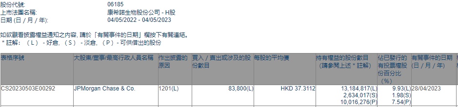 智通财经APP获悉,香港联交所最新资料显示,4月28日,小摩减持康希诺生物(06185)8.38万股,每股作价37.3112港元,总金额约为312.67万港元。减持后最新持股数目约为1318.48万股,最新持股比例为9.93%。