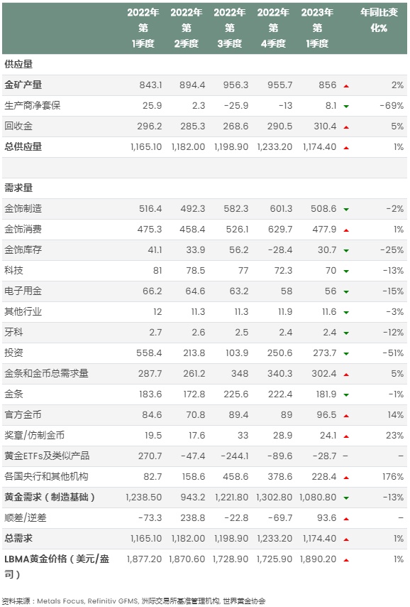 一季度伦敦金(LBMA)平均午盘价为1,890美元/盎司,同比小幅上涨。此价格比上季度均价高出10%以上,几乎持平于2020年三季度创下的历史纪录。在疫情相关政策放开后的第一个季度,中国的黄金消费大幅回升。国内经济的复苏和居民收入的健康增长,重燃中国消费者对黄金的热情;同时,金价上涨也引发关注,进一步激发了黄金投资者的兴趣。