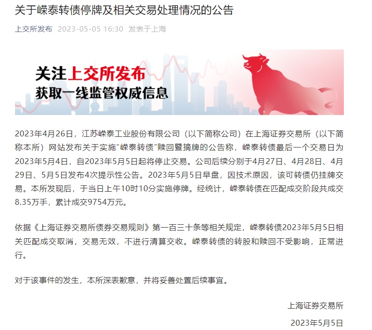 公告显示,4月26日,江苏嵘泰工业股份有限公司在上交所网站发布关于实施“嵘泰转债”赎回暨摘牌的公告称,嵘泰转债最后一个交易日为2023年5月4日,自2023年5月5日起将停止交易。公司后续分别于4月27日、4月28日、4月29日、5月5日发布4次提示性公告。2023年5月5日早盘,因技术原因,该可转债仍挂牌交易。经统计,嵘泰转债在匹配成交阶段共成交8.35万手,累计成交9754万元。