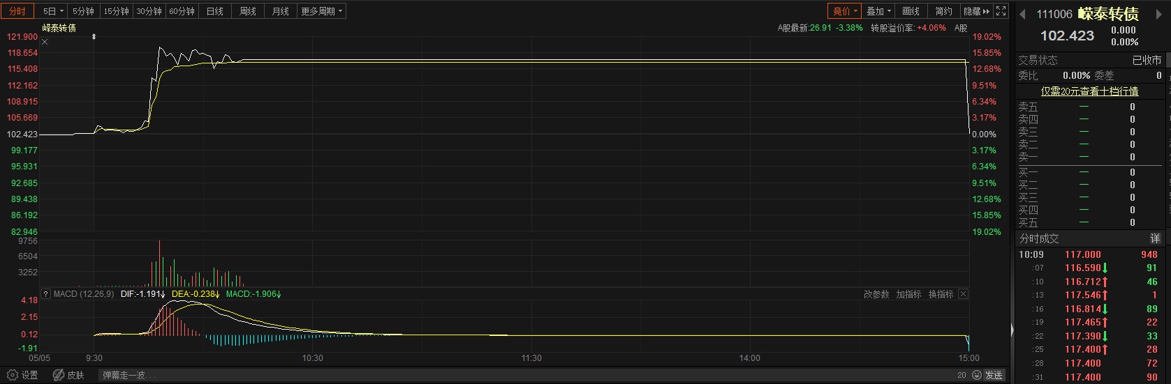 据悉,5月5日wind、同花顺等证券交易终端显示,已经公告停止交易的嵘泰转债,5月5日早盘依然在市场交易,并在盘中一度大涨17%。截至10时10分临时停牌,嵘泰转债市价为117.353元。