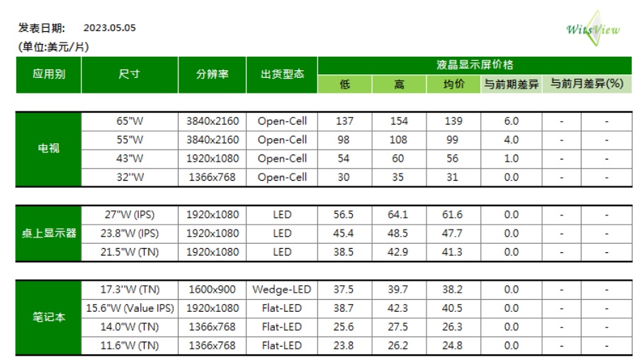 智通财经APP获悉,根据TrendForce集邦咨询旗下面板研究中心WitsView睿智显示调研数据,2023年5月上旬,电视各尺寸面板价格进一步上涨,而其他产品的均价则维持不变,具体如下: