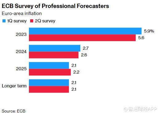 智通财经APP获悉,专业人士认为欧洲央行将需要更长时间才能达到其通胀目标。欧洲央行的季度调查显示,受访者预计今年和明年的通胀率分别为5.6%、2.6%,低于三个月前预测的5.9%、2.7%。不过,受访者对2025年的通胀预测从三个月前的2.1%上调至2.2%,尽管长期通胀预测维持在2.1%不变。