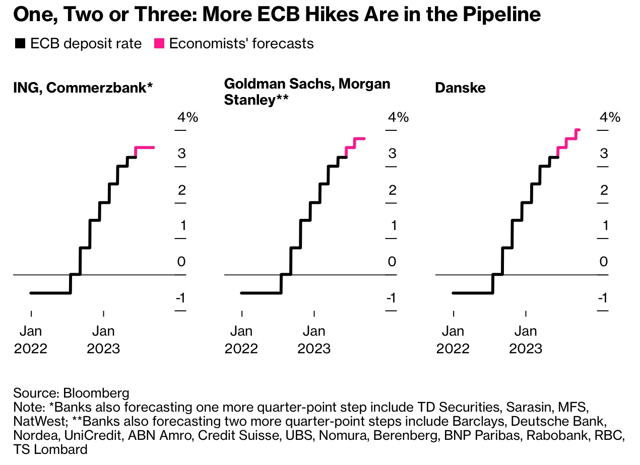 对于欧洲央行还将加息多少,市场有不同看法。包括高盛、摩根士丹利在内的华尔街银行预计,欧洲央行还会加息两次,每次各25个基点,最终将把存款机制利率提高至3.75%。荷兰国际集团和德国商业银行认为欧洲央行只会再加息一次。丹麦银行则认为欧洲央行还会加息三次,存款机制利率最终将为4%。