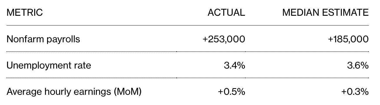 智通财经APP获悉,美国劳工统计局周五公布的数据显示,美国4月非农就业新增25.3万人,高于市场预期的18万人。失业率从3月的3.5%进一步下降至3.4%,低于市场预期的3.6%。平均时薪同比涨幅为4.4%,高于市场预期的4.2%和前值4.2%;平均时薪环比涨幅为0.5%,为一年来最高水平,高于市场预期的0.3%和前值0.3%。这份数据表明,美国4月新增就业和工资增长均超出预期,反映出尽管宏观经济逆风不断加剧,但劳动力市场仍有弹性,同时也显现出新的通胀压力的迹象。