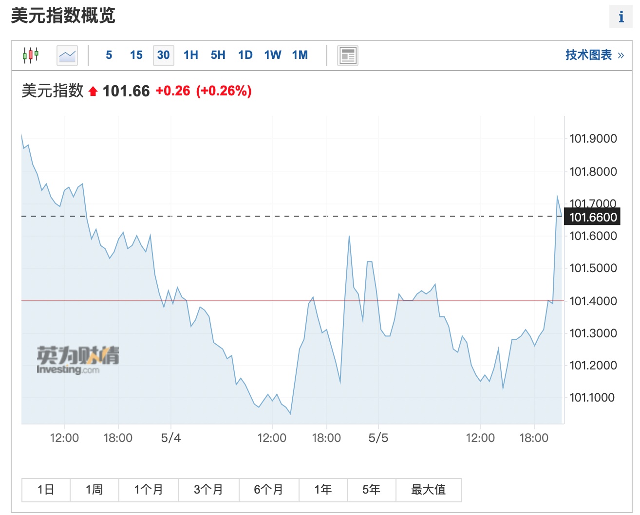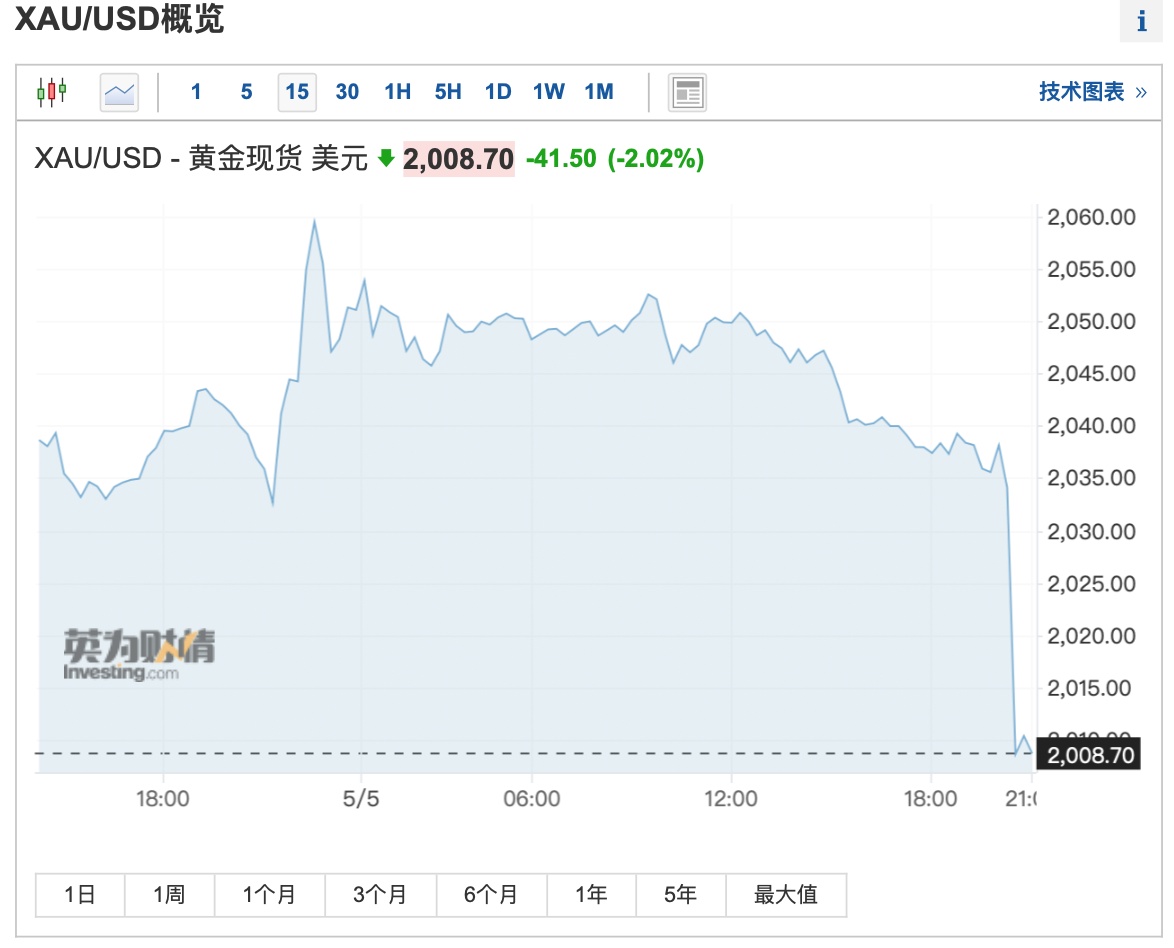 美国4月非农数据公布后,截至发稿,美元指数涨0.26%,报101.66。现货黄金跌逾2%,报2008.7美元/盎司。