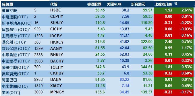 大型蓝筹股上涨居多,汇丰控股收报58.45港元,较港收市升2.61%;腾讯控股收报344.61港元,较港收市涨0.51%。