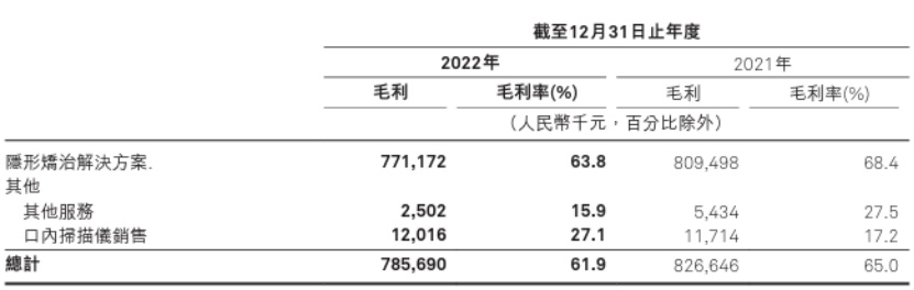 由于隐形矫治器的平均售价降低、雇员福利开支增加及与新制造设施相关的折旧及摊销成本增加等因素,时代天使隐形矫治解决方案业务的毛利率由2021年的68.4%减少到2022年的63.8%。而其他服务毛利率同比减少11.6和百分点至15.9%,口内扫描仪销售毛利率同比增加9.9个百分点至27.1%,口扫毛利增加主要由于供应商提供返利。