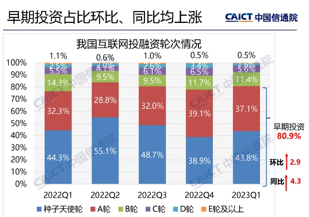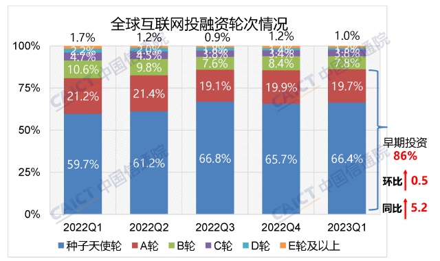 早期轮次融资占比维持高位。2023Q1,我国早期轮次融资案例数占比80.9%,全球早期轮次融资案例数占比86.1%,均维持在80%以上的高位。
