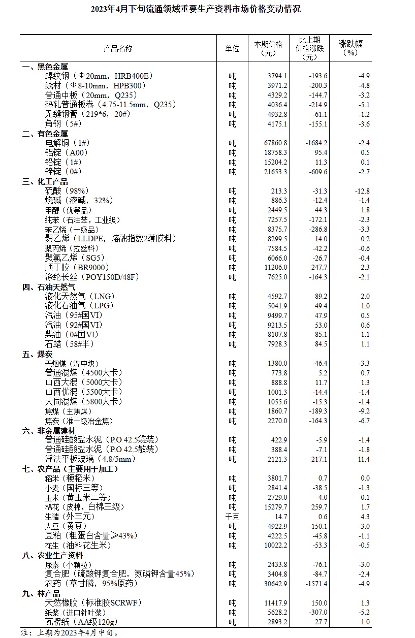 智通财经APP获悉,5月7日,国家统计局发布2023年4月下旬流通领域重要生产资料市场价格变动情况。据对全国流通领域9大类50种重要生产资料市场价格的监测显示,2023年4月下旬与4月中旬相比,19种产品价格上涨,30种下降,1种持平。其中,生猪(外三元)价格为14.7元/千克,环比上涨4.3%;电解铜价格为67860.8元/吨,环比下降2.4%。