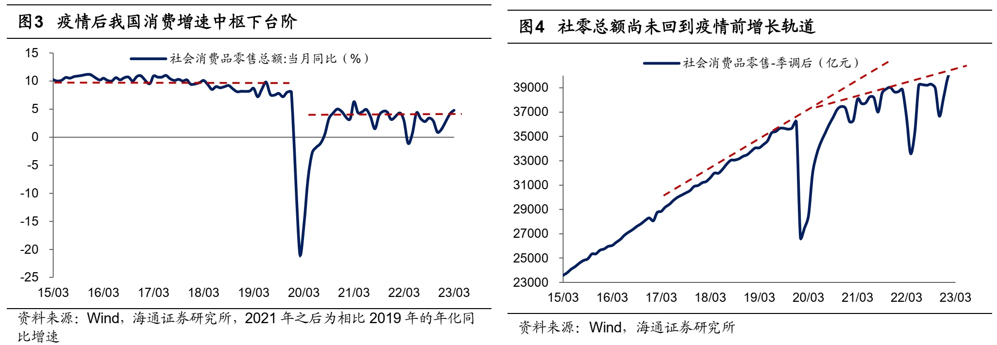 从总量来看,疫情后消费增速降了一个台阶。23年一季度社消零售总额年化同比增速在4.5%左右,较去年四季度明显改善。但疫情前(2015-2019年)社消零售总额的增速中枢在9%左右,当前消费增长和疫情之前比还有较大差距。若剔除基数的影响,在疫情影响较小的2020年下半年和2021年,社消零售总额的平均增速也在4.5-5%之间。23Q1的消费增速仅回到21年的状态,消费的恢复还偏弱。