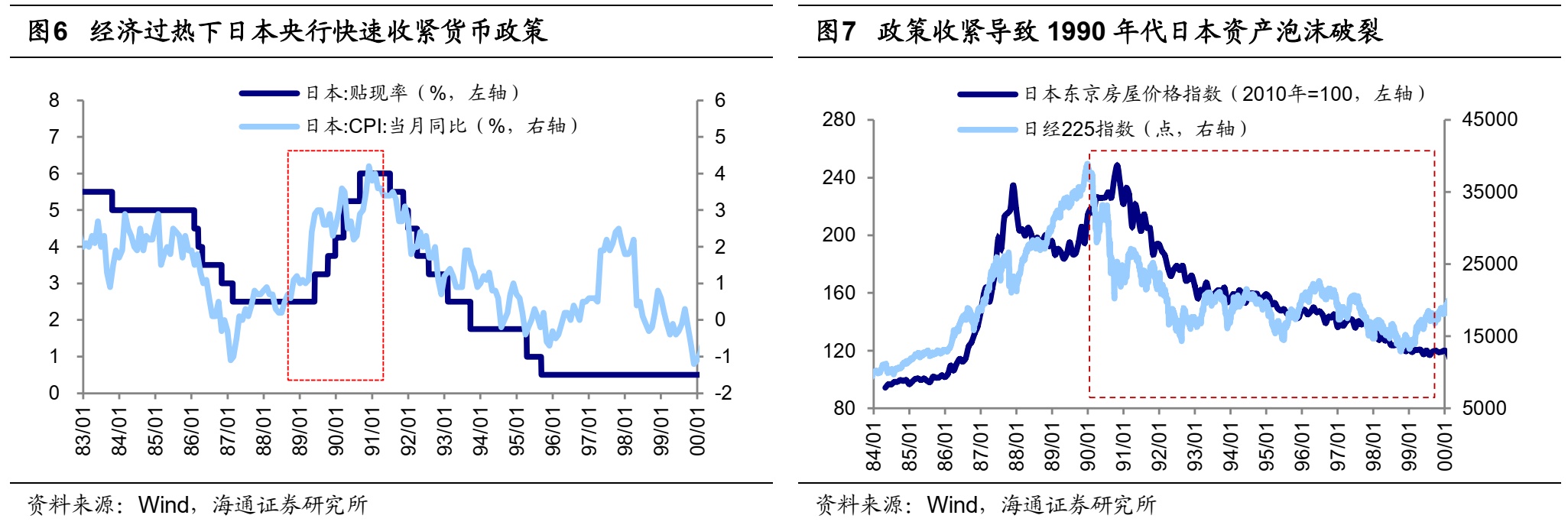 1980年代货币宽松推高日本资产价格,90年代初政策收紧资产泡沫破裂。1985年《广场协议》后,日元不断升值打击了日本出口,为应对经济下行压力,日本采取扩张性的宏观政策刺激国内需求。宽松的货币政策叠加金融自由化背景下监管松懈、国外热钱涌入,大量资金流入日本股市、楼市。盲目的信心以及过剩的资本导致企业和居民大肆借款,1985-87年间日本家庭每年新增住房贷款增速高达50-60%,强化了日本股市和房市只涨不跌的预期,资产泡沫迅速膨胀,1986-1991年间日本东京、大阪土地价格指数最大涨幅分别为141%、189%,日经225指数最大涨幅为200%。1989年日本CPI当月同比升破3%,经济过热逐渐显现,日本开始快速收紧货币和土地政策,1990年后房价和股指见顶并迅速下跌,1990-2010年期间日本东京房屋价格指数最大跌幅达63%,日经225指数最大跌幅达82%。