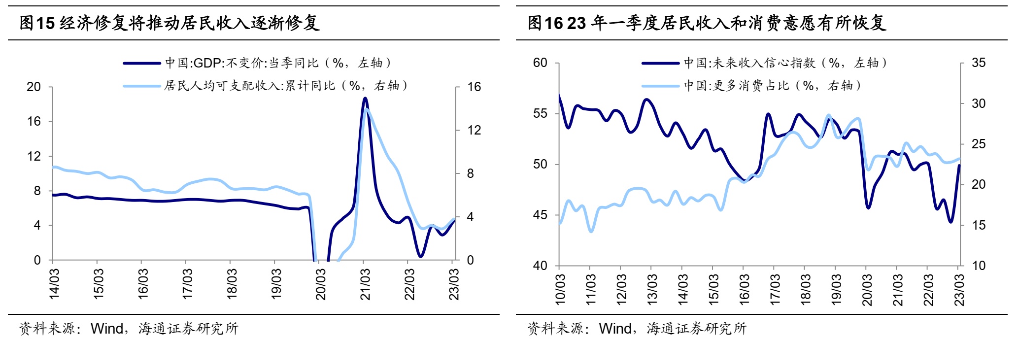 经济复苏推动居民收入修复,将为消费提供支撑。习总书记在22年12月的中央经济工作会议上提出,消费是收入的函数,要多渠道增加城乡居民收入,特别是要提高消费倾向高、但受疫情影响大的中低收入居民的消费能力。当前疫情对线下消费场景的影响已经基本消除,无论城市内还是城市间人口流动都已恢复到疫情前水平。往后看,国内消费修复更需关注居民收入水平和消费意愿的提升。我们在《行稳致远——中央政治局会议解读及对股债的影响-20230429》中提出,当前国内经济已进入复苏期。23Q1实际当季同比增速为4.5%,环比增长2.2%,已呈现温和修复的态势,经济的修复也将带来居民收入的恢复。收入是消费的函数,居民收入的修复或对国内消费形成支撑。根据央行数据,23Q1我国居民未来收入信心指数已经回升至49.9%;居民消费意愿也有所抬升,23Q1居民消费倾向为62.0%,为2020年疫情开始以来的最高值。但是相比于疫情前的水平,当前居民的消费倾向仍然偏低,这说明居民对未来的预期仍在相对低位。