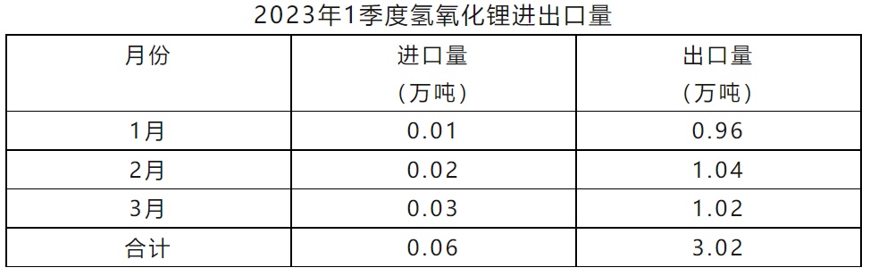 1-3月,氢氧化锂进口量0.06万吨,出口量3.02万吨,净出口量2.96万吨。