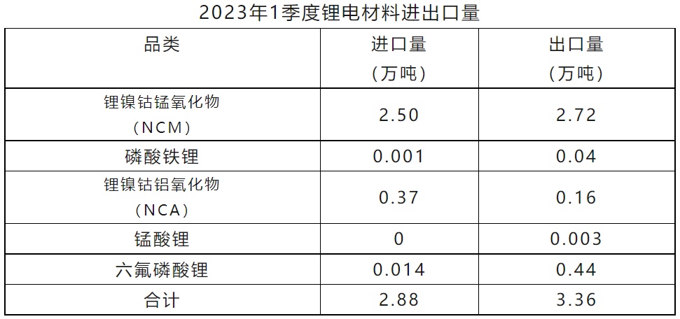 1-3月,主要锂电材料镍钴锰酸锂、磷酸铁锂、镍钴铝酸锂、锰酸锂、六氟磷酸锂合计进口量2.88万吨,合计出口量3.36万吨。