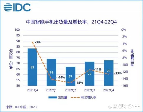 据IDC发布的手机行业跟踪报告,2022年,中国智能手机市场延续了低迷走势,全年出货量约为2.86亿台,同比下降13.2%,创下有史以来的最大降幅。此外,这也是时隔10年后中国智能手机市场出货量再次回落到3亿以下。