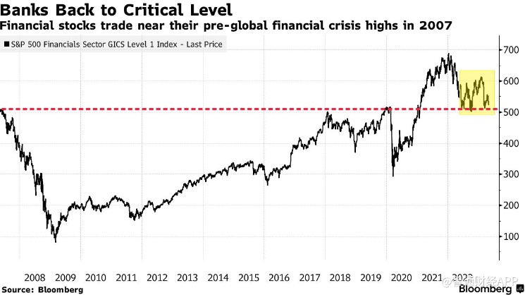 智通财经APP了解到,随着第一共和银行(FRCB.US)的倒闭加剧了人们对地区银行偿付能力的担忧,投资者纷纷抛售金融类股,导致标普500金融指数接近跌破2007年的峰值。从这个角度来看,2008年信贷危机后,该指数花了10多年时间才收复失地。