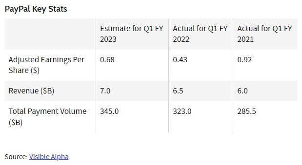 智通财经APP获悉,全球最大在线支付提供商PayPal(PYPL.US)将于周一美股盘后公布2023年第一季度财务业绩。华尔街预计,PayPal