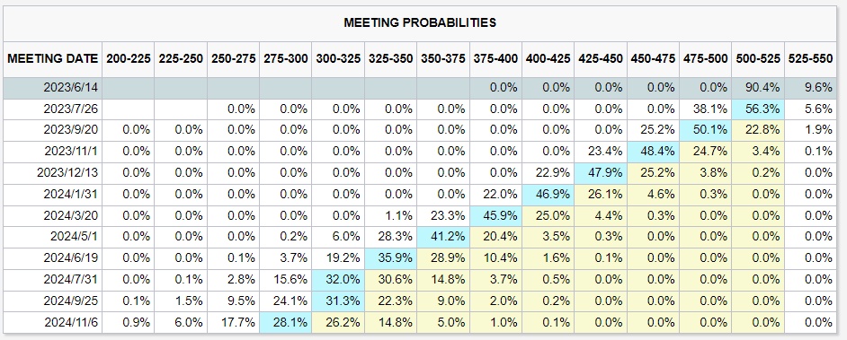 目前市场预计,美联储将在6月的会议上维持利率不变,美联储选择再次小幅加息的可能性很小。这种情况只有在通胀远高于预期的情况下才有可能发生。同时,市场仍认为美联储很有可能在9月份甚至7月份降息。为了实现这一目标,我们可能需要在即将发布的数据中看到更多通货膨胀率明显下降的趋势,或者美国经济的一些疲软,例如就业市场的疲软。