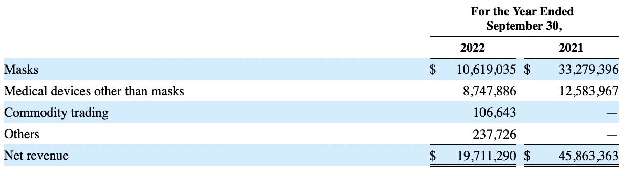 而口罩以外的医疗设备作为公司公司的另一个主要营收来源,于期内也出现营收下滑的现象。智通财经APP了解到,口罩以外的医疗设备主要是麻醉和呼吸道消耗品。该分部的医疗器械销售额从2021财年的1258.40万美元,下滑至2022财年的358.39万美元,同比下降了30.5%。对此公司解释称,该分部营收的减少主要是受到新冠疫情的影响,公司的营销和商业活动减少。